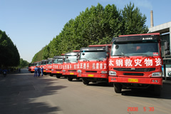 2008年5月30日,我公司選派3公司10臺豪沃8X4自卸車,承擔(dān)了太鋼支援甘肅地震災(zāi)區(qū)700頂帳篷等物資的緊急運送任務(wù)。