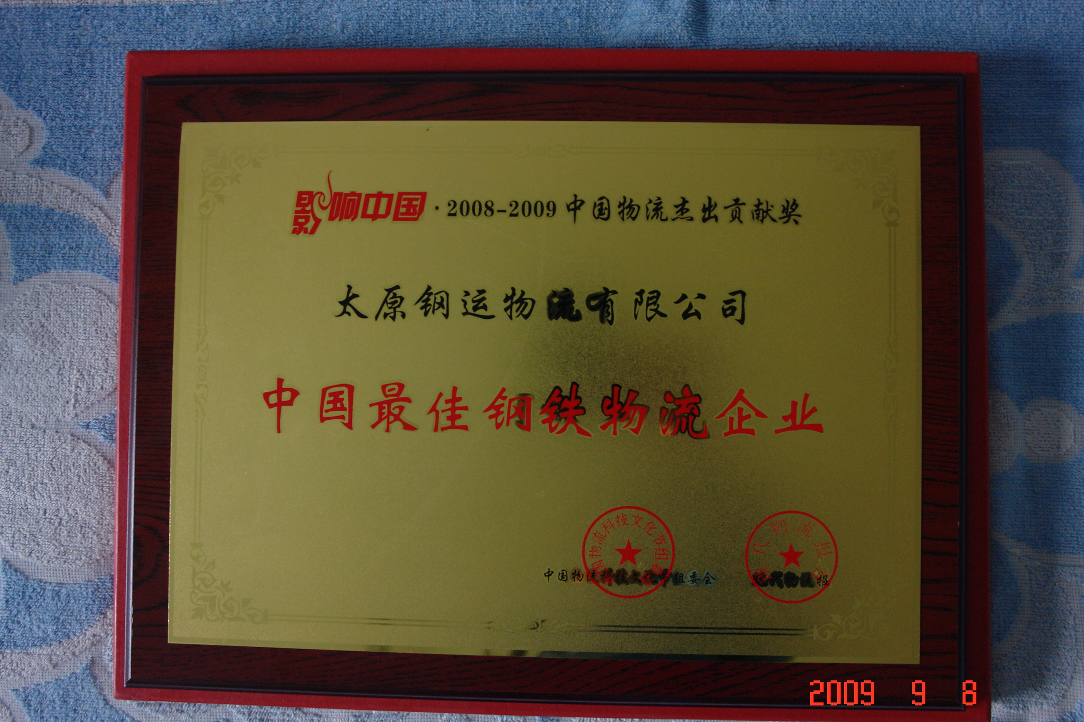 2009年9月3日,我公司在"第三屆中國(蘇州)國際物流與供應(yīng)鏈合作發(fā)展高峰論壇"暨"影響中國2008--2009中國物流杰出貢獻(xiàn)獎(jiǎng)"表彰活動(dòng)中,被授予"中國**佳鋼鐵物流企業(yè)"榮譽(yù)稱號(hào)。