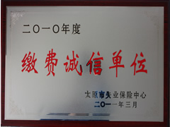 2011年3月22日,我公司榮獲太原市失業(yè)保險(xiǎn)中心頒發(fā)的《2010年度繳費(fèi)誠信單位》榮譽(yù)稱號(hào)。我公司在2010年度太原市失業(yè)保險(xiǎn)繳費(fèi)誠信單位表彰活動(dòng)中,認(rèn)真履行繳費(fèi)義務(wù),依法維護(hù)勞動(dòng)者合法權(quán)益,受到太原市失業(yè)保險(xiǎn)中心的認(rèn)可。