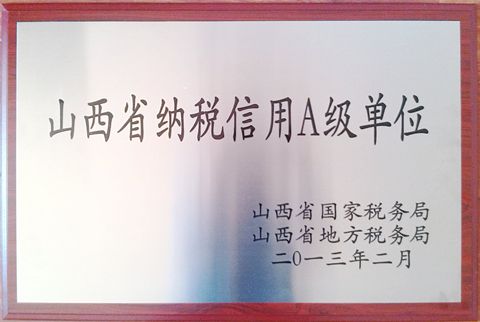 2014年元月15日,我公司榮獲省國稅、省地稅聯(lián)合頒發(fā)的“山西省納稅信用A級單位”榮譽稱號。