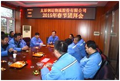 2015年2月19日,公司召開春節(jié)團(tuán)拜會。公司總經(jīng)理胡永生代表董事會向全體職工及家屬送上誠摯的春節(jié)祝福,同時(shí)各部門各分公司經(jīng)理也表達(dá)出對鋼運(yùn)物流的深切祝福。會后,總經(jīng)理助理尹躍飛、郝建國深入現(xiàn)場慰問一線職工。