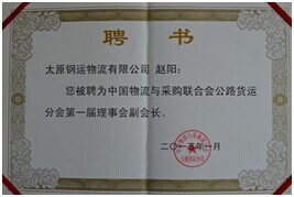 2015年3月5日受中國物流與采購聯(lián)合會(huì)邀請,公司總經(jīng)理胡永生赴上海參加中國物流與采購聯(lián)合會(huì)公路貨運(yùn)分會(huì)一屆二次理事會(huì)。我公司被大會(huì)選為“中國物流與采購聯(lián)合會(huì)公路貨運(yùn)分會(huì)副會(huì)長單位”,公司董事長趙陽被聘為公路貨運(yùn)分會(huì)****屆理事會(huì)副會(huì)長。